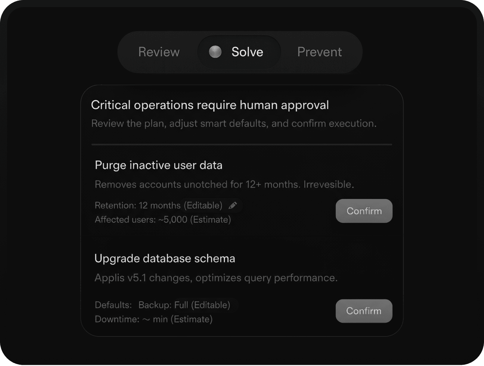 Critical operations require human approval. Rebase shows you exactly what it will do before executing, with smart defaults you can customize.