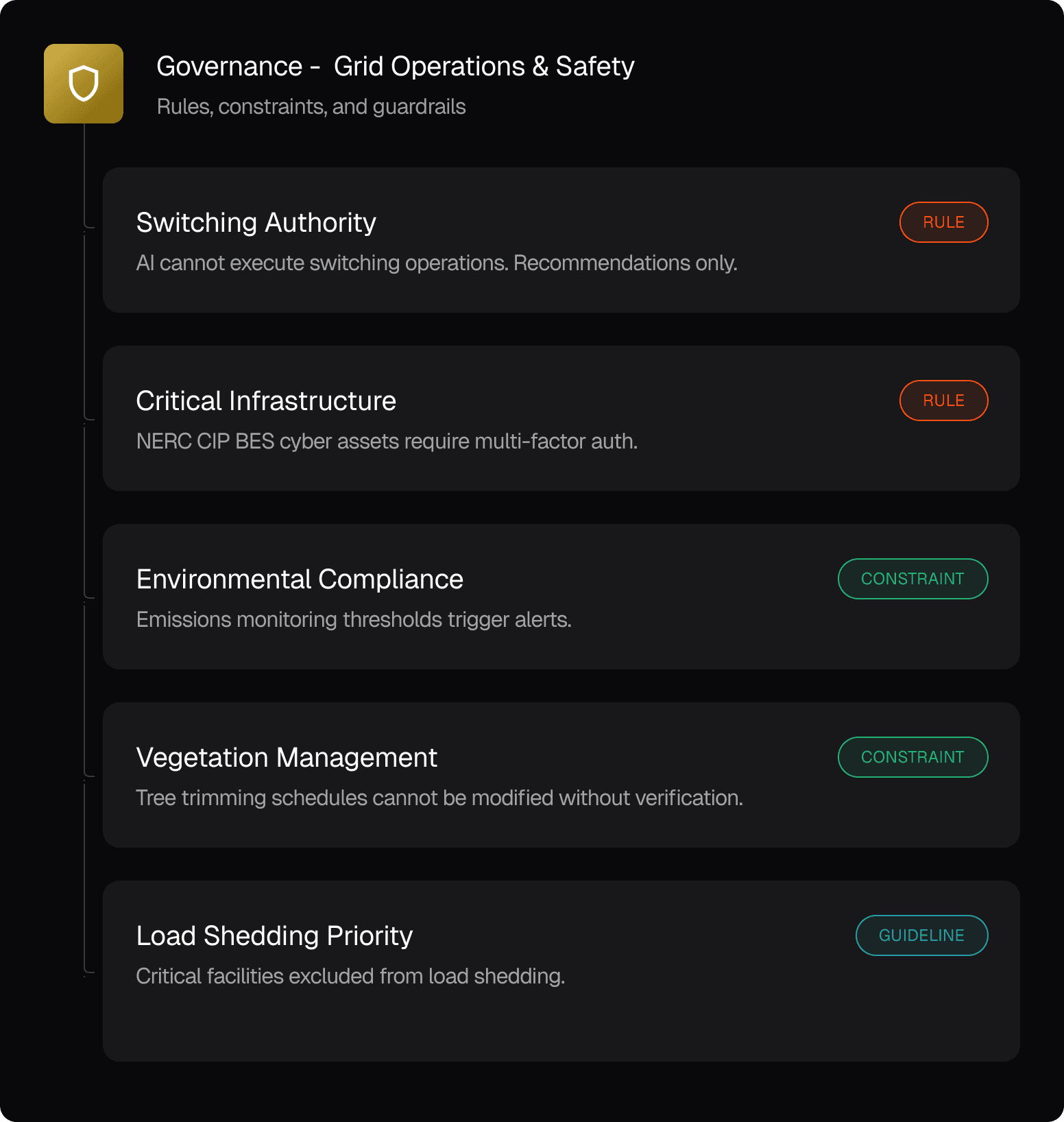 Enforce NERC CIP requirements, safety protocols, environmental regulations, and access policies on every AI action. Compliance built in, not bolted on.