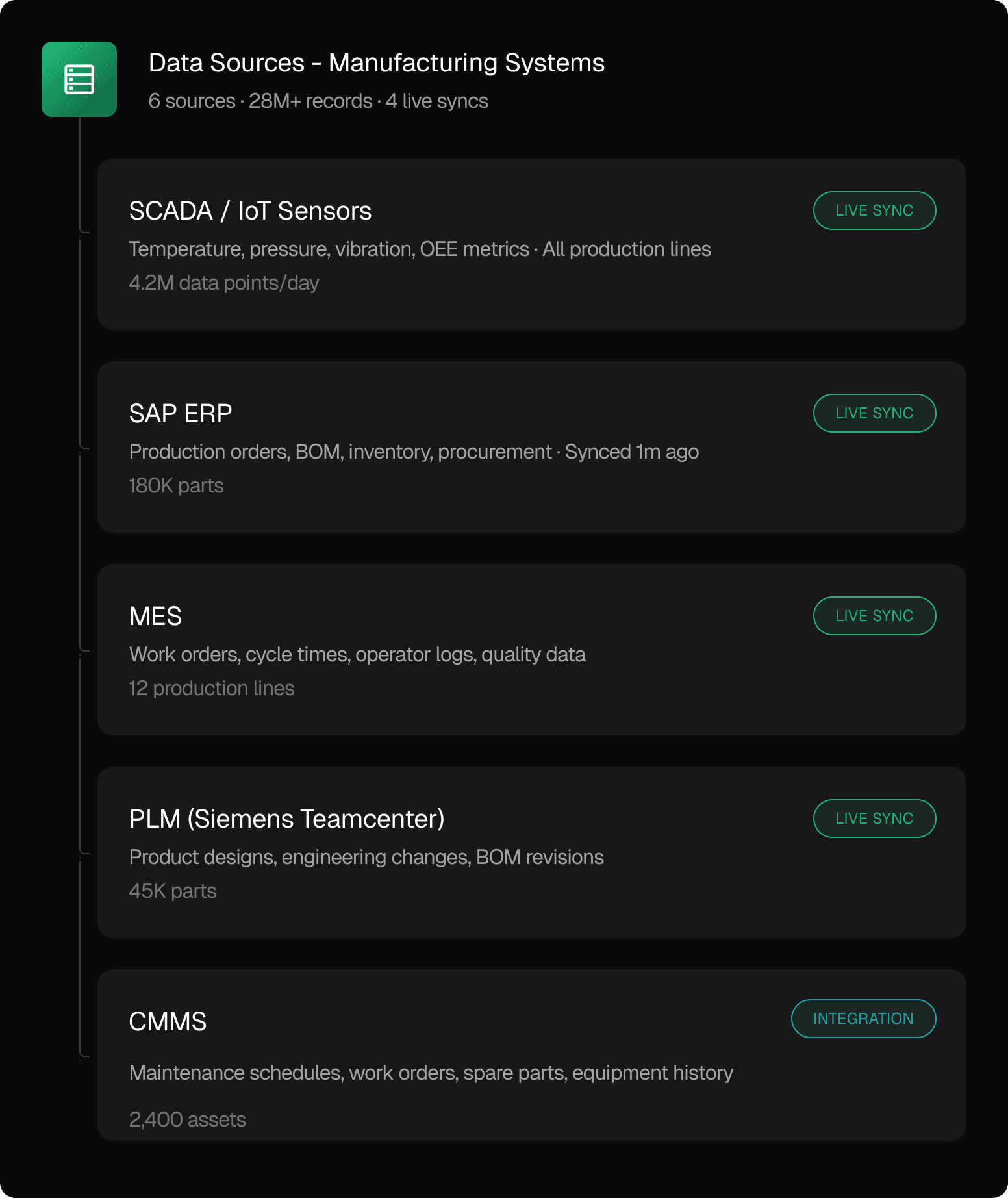 Unify data from MES, ERP, PLM, SCADA, and IoT sensors into a live knowledge graph. Every plant stays in sync no data lake required.