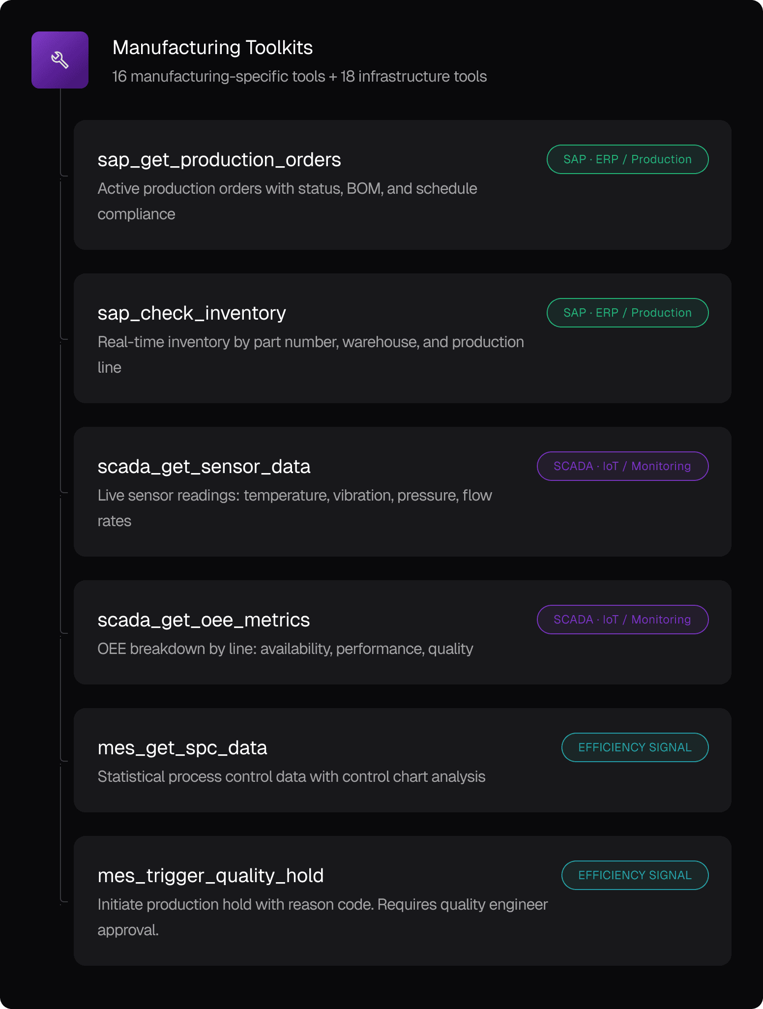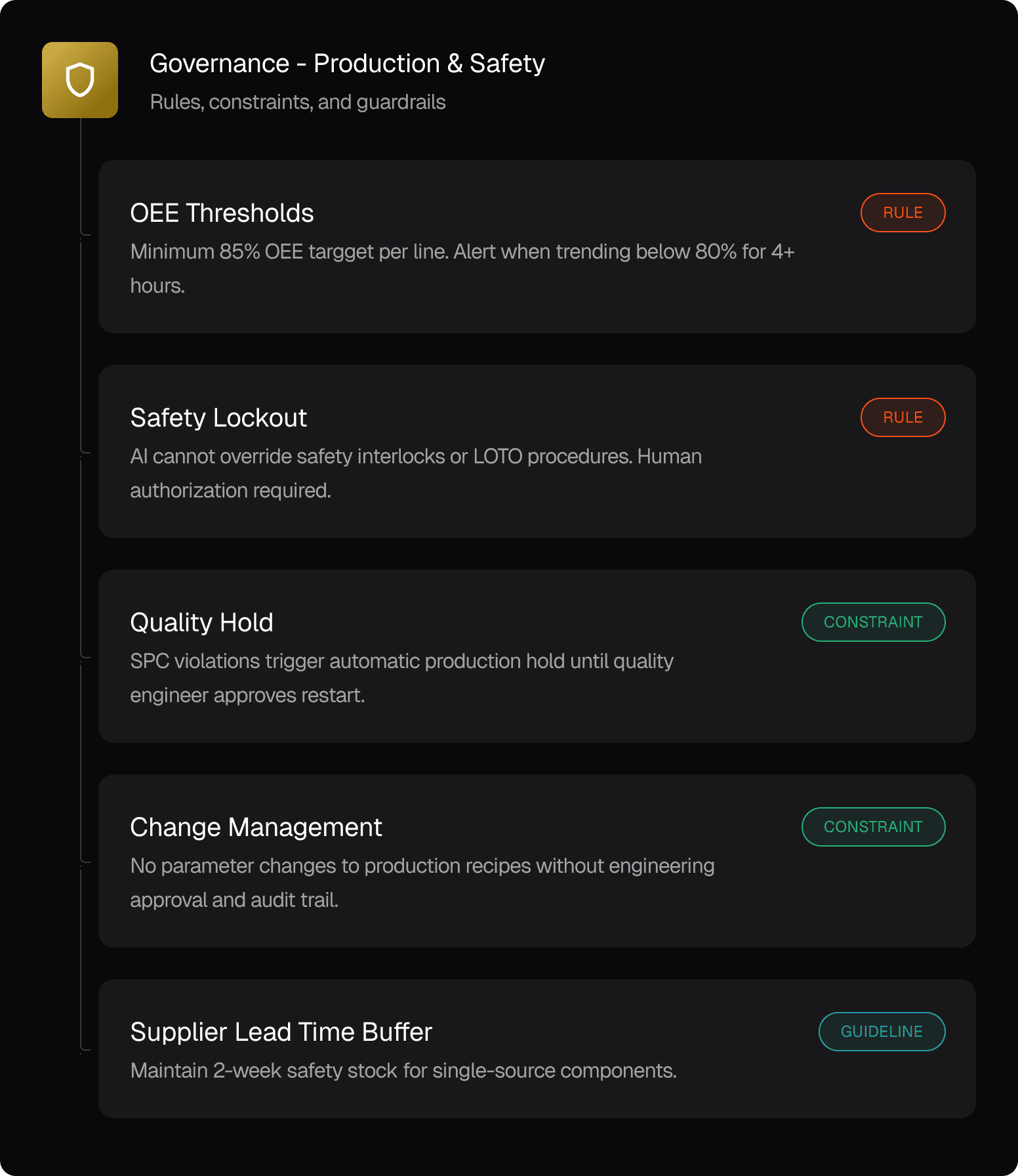 Enforce safety protocols, quality standards, production constraints, and access policies on every AI action. Compliance built in, not bolted on.