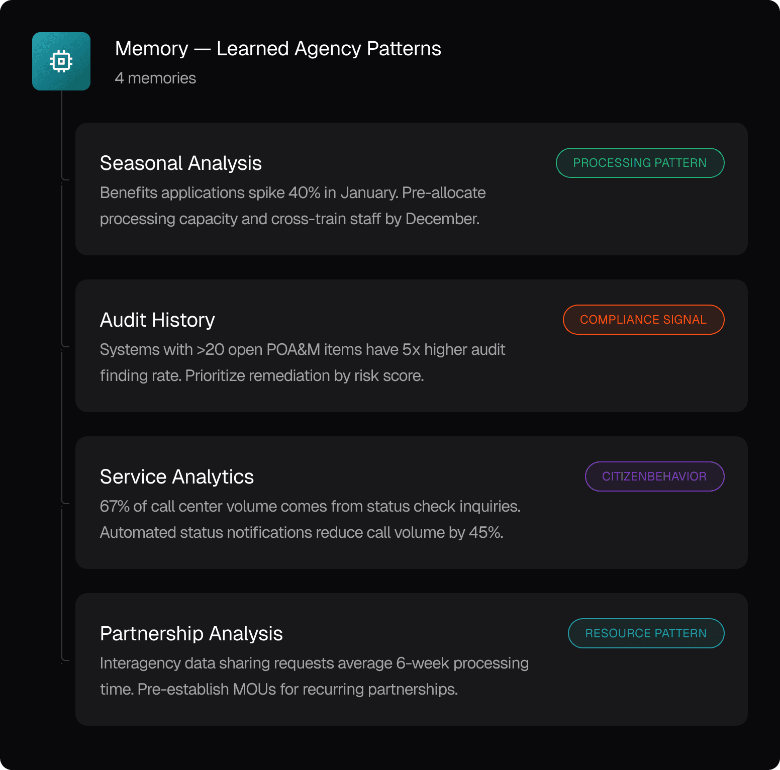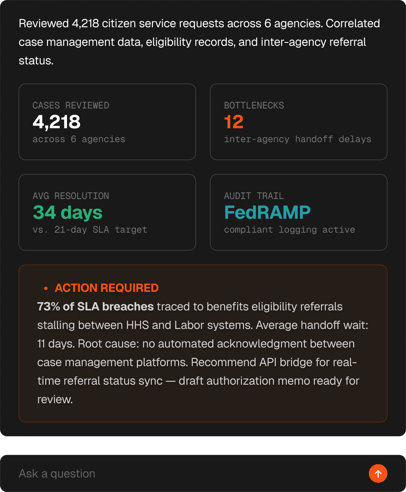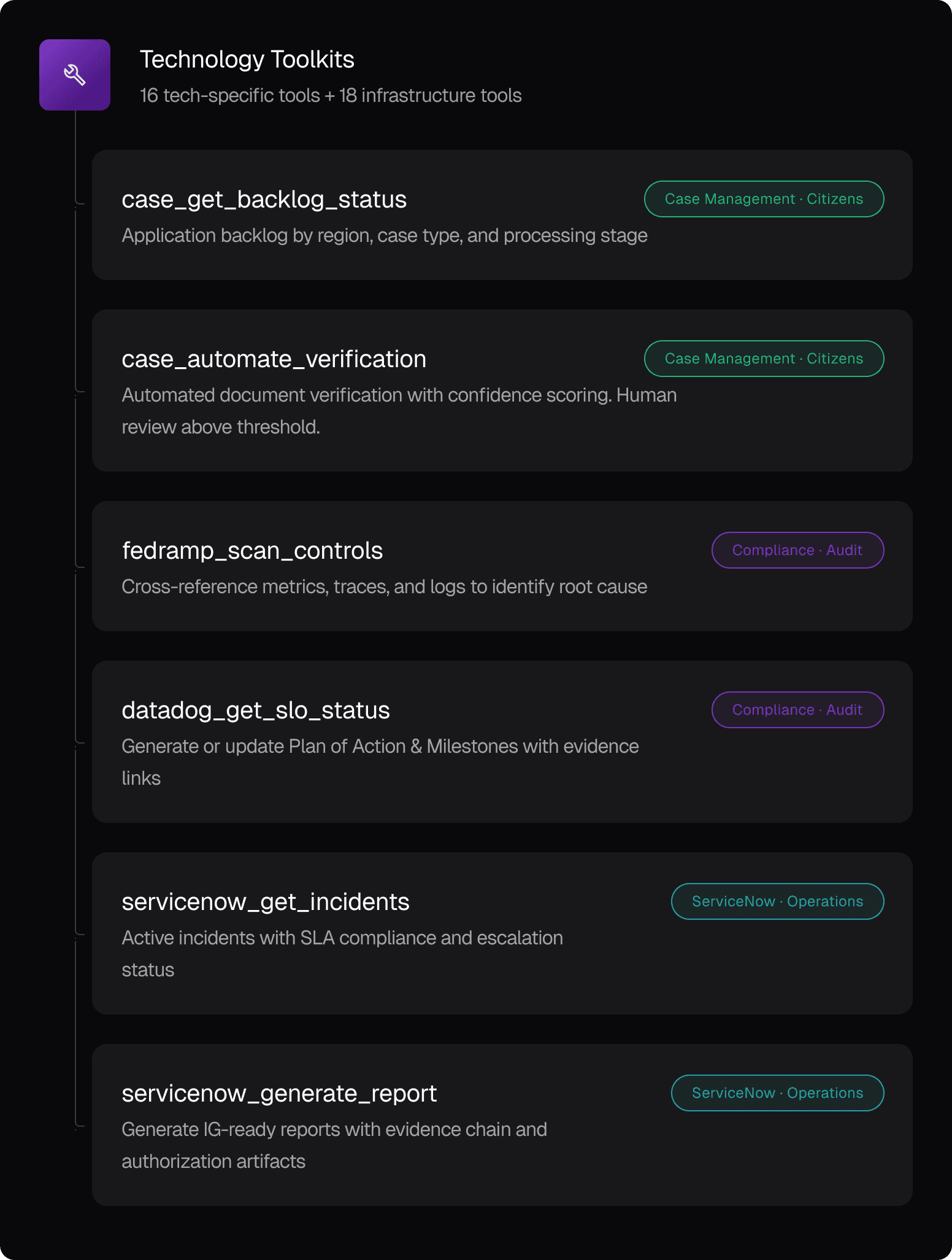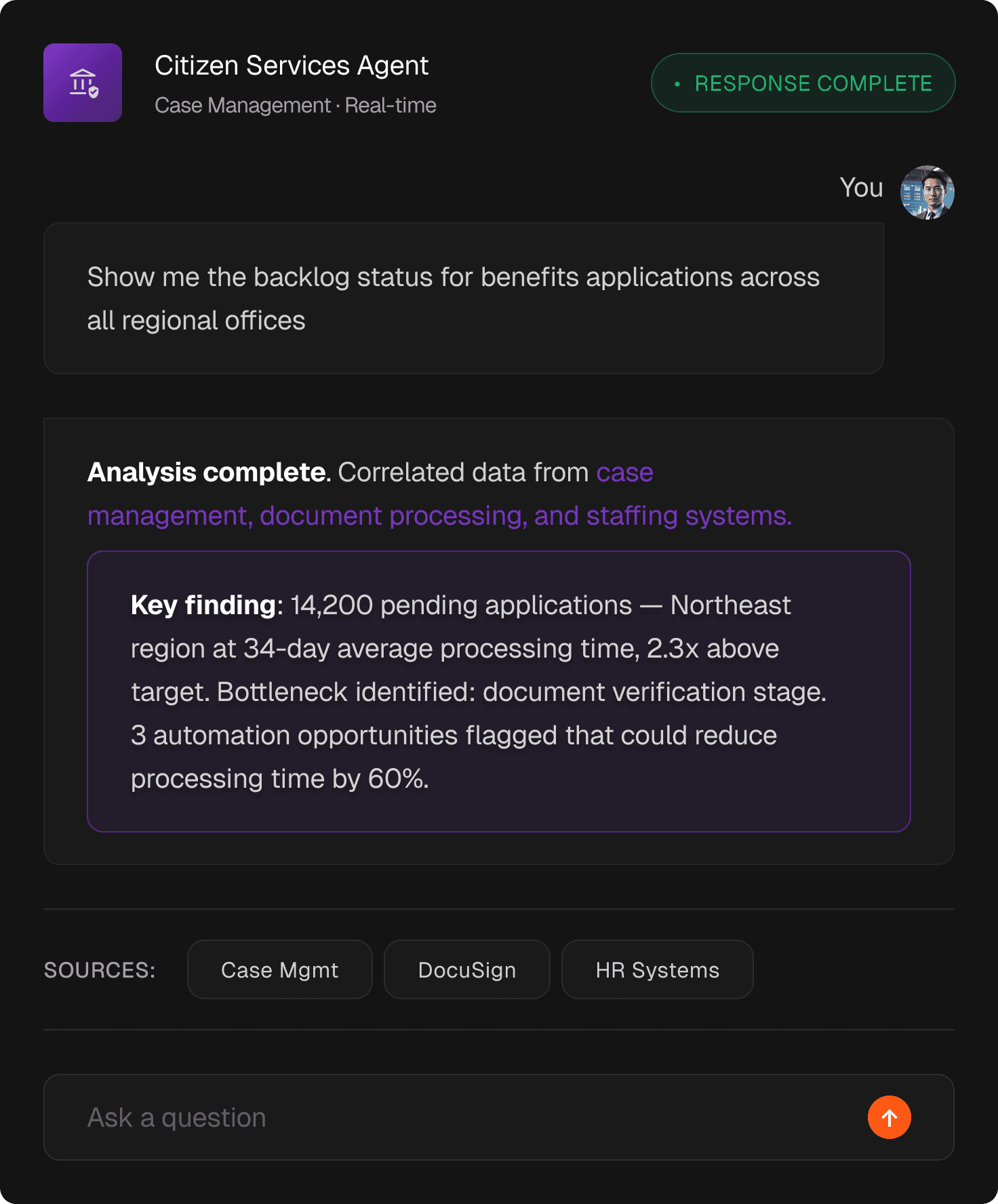 Deploy agents that reason across ServiceNow, legacy databases, and your agency systems — with human-in-the-loop review at every critical step.