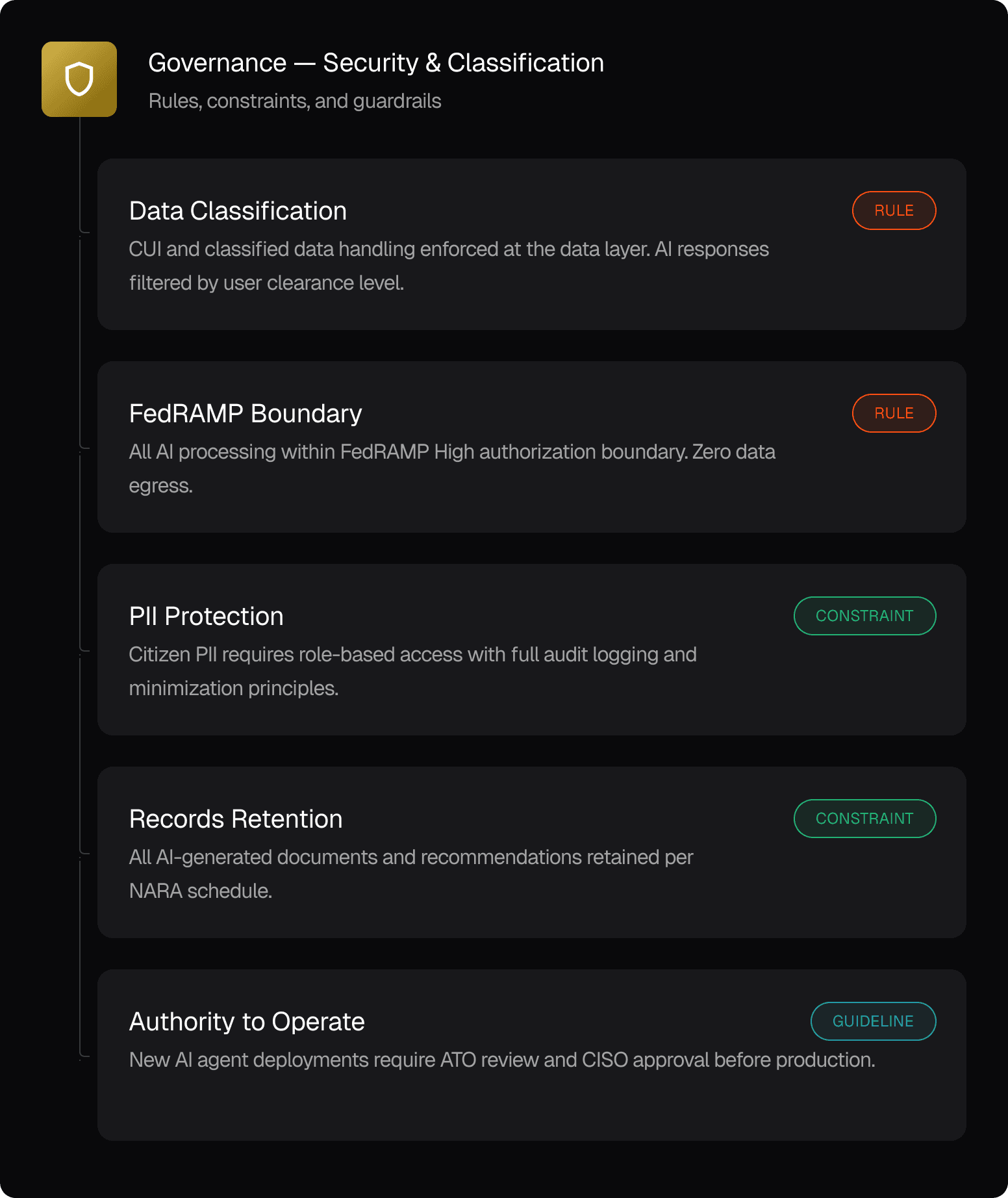 Enforce FedRAMP requirements, data classification levels, FISMA controls, and access policies on every AI action. Compliance built in, not bolted on.