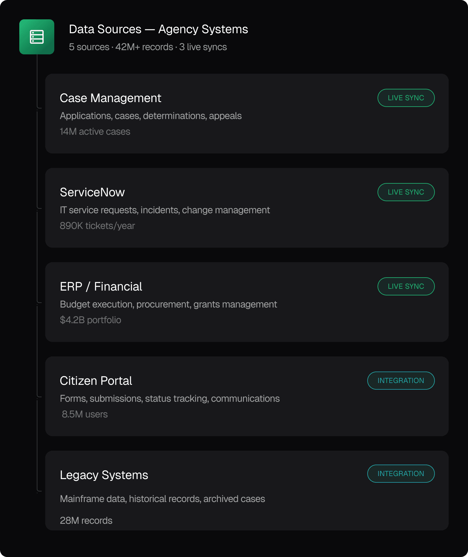 Unify data from case management, ERP, citizen portals, and legacy systems into a live knowledge graph. Every agency system stays in sync — no data migration required.