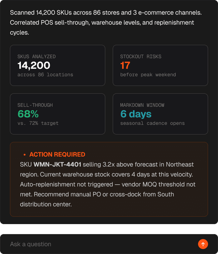 Deploy agents that reason across your entire retail stack — automating merchandising, support, and supply chain with human oversight.